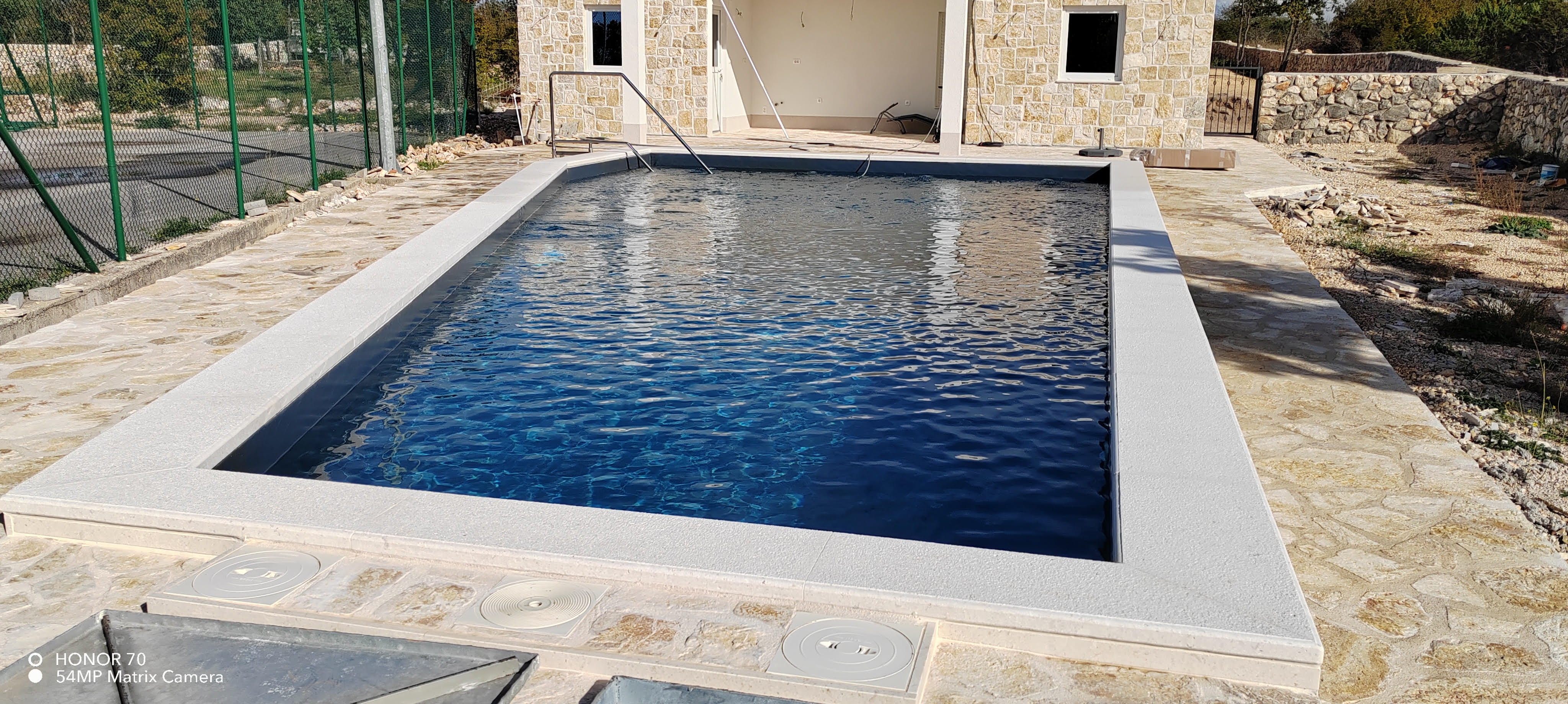 Bazen ukoliko je betonski može se odraditi u nekoliko opcija. Prva i najeftinija solucija je bojanje bazena bojama predviđenim za beton ili hidroizolacijama u boji. Druga solucija je PVC folija koja može biti debljine 1,5mm ili 2mm raznih dezena i koja je po nama best buy opcija jer je jednostavna za održavanje, cijenovno je jeftinija u samoj gradnji školjke bazena a i u samom materijalu od keramike/mozaika. Treća opcija je mozaik/keramika koja je najprestižnija opcija i najskuplja te opcija za koju je potrebno hidroizolirati vanjski dio bazenske školjke a i unutrašnjost bazena.